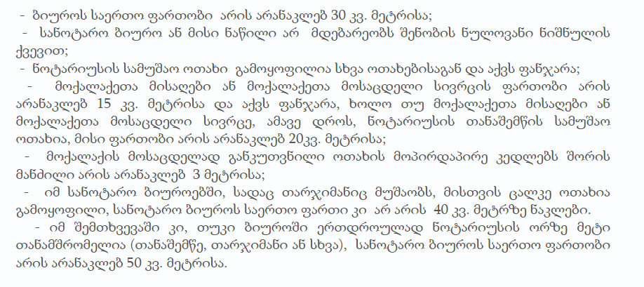 პანდემიის პირობებში, გარდა ცალკე გამოყოფილი ფართებისა, ნოტარიუსებს დაუწესეს კვადრატულობის მინიმუმები და სხვა მოთხოვნები (ბიუროს საერთო ფართობი იყოს არანაკლებ 30 კვ. მეტრისა).